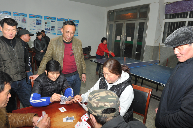 夜晚散步,一跨進(jìn)位于江蘇農(nóng)墾淮海農(nóng)場(chǎng)城東居委會(huì)活動(dòng)室內(nèi),頓感這里人聲鼎沸,暖意融融。這邊乒乓球在球拍來(lái)回推擋中眼花繚亂,抽殺正酣,那邊一溜排開(kāi)的3張桌子上擠滿了人,玩著爭(zhēng)上游、摜蛋等撲克游戲。