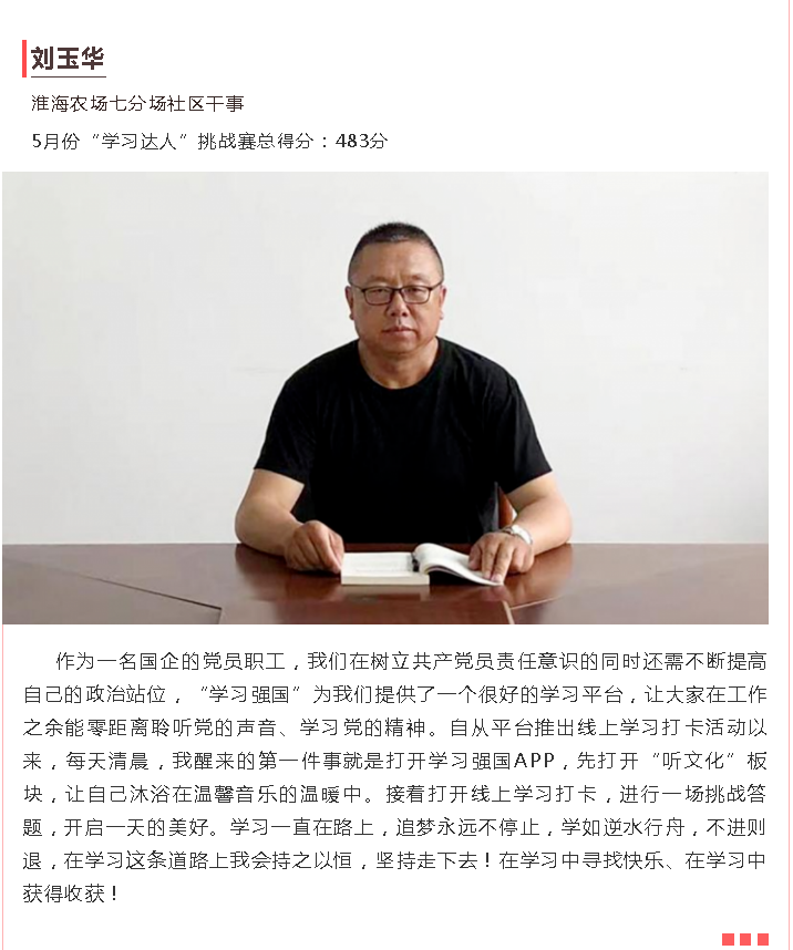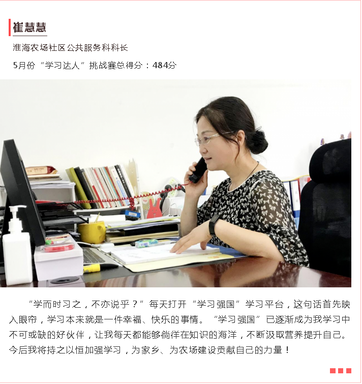 為充分展示“學(xué)習(xí)達(dá)人”風(fēng)采,根據(jù)射陽(yáng)縣“強(qiáng)國(guó)復(fù)興有我”群眾性主題宣傳教育活動(dòng)安排,射陽(yáng)宣傳推出“訪(fǎng)學(xué)習(xí)達(dá)人看家鄉(xiāng)變化”主題尋訪(fǎng)萬(wàn)里行活動(dòng)第一期,在全縣5月份最厲害的11名“學(xué)習(xí)達(dá)人”中,淮海的“學(xué)習(xí)達(dá)人”馮輝、陳祥、崔慧慧、劉玉華躋身其中,讓我們一起來(lái)聽(tīng)聽(tīng)淮海的“學(xué)習(xí)達(dá)人”們?cè)诠ぷ髦?、生活上?/span>心得感悟吧!圖為淮海學(xué)員“學(xué)習(xí)達(dá)人”們的心聲感悟。