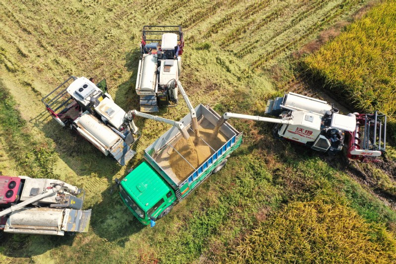 10月17日,寶應湖農(nóng)場5萬畝稻田開鐮試割。三四臺收割機來回穿梭、相互協(xié)作,粒粒飽滿的水稻收割脫粒,很快就被裝進運輸車里,隨后運送至場頭過磅晾曬。農(nóng)技人員穿梭在剛收割完畢的田塊里,根據(jù)收割機的實際收割質(zhì)量,進行指揮調(diào)整,把“豐收在望”變成“豐收在手”。
