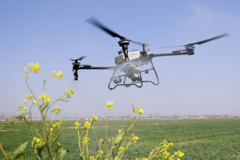 在三河農(nóng)場邱上營分場的麥田里,植保無人機(jī)進(jìn)行飛防作業(yè)。 顏懷峰 錢厚紅 攝