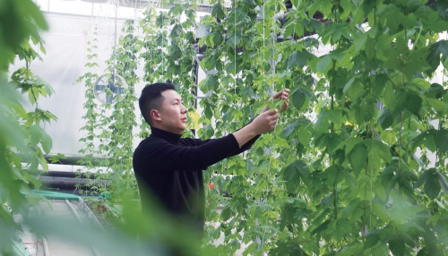江蘇農(nóng)墾集團(tuán)云臺(tái)農(nóng)場(chǎng)利用資源優(yōu)勢(shì),積極與龍頭企業(yè)、科研機(jī)構(gòu)對(duì)接,開(kāi)發(fā)特色種植。目前,與蘇墾麥芽公司訂單種植的大棚啤酒花長(zhǎng)勢(shì)喜人。圖為技術(shù)人員正在為新長(zhǎng)出的啤酒花側(cè)枝繞蔓?! 〕誊姟z