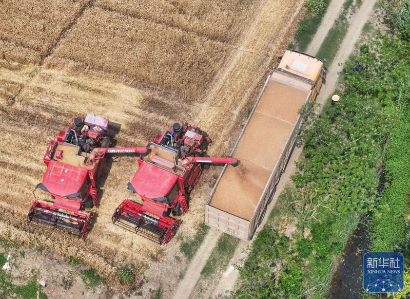 5月28日,在三河農(nóng)場,收割機(jī)將小麥裝車(無人機(jī)照片)。新華社記者 季春鵬 攝