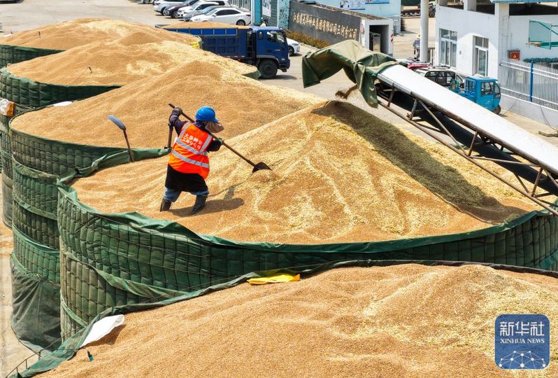 三河農(nóng)場收獲的小麥進(jìn)入大華種業(yè)三河分公司存儲(chǔ)(5月28日攝,無人機(jī)照片)。新華社記者 季春鵬 攝