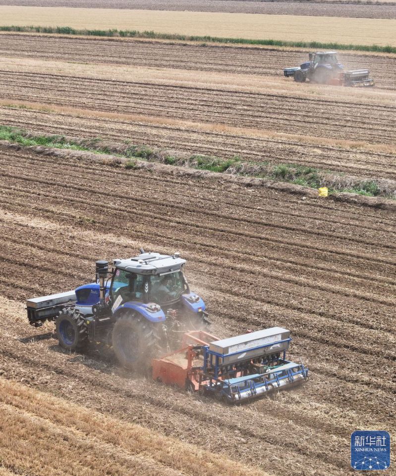 5月28日,揚(yáng)州大學(xué)研制的“九合一”稻麥耕播機(jī)在三河農(nóng)場播稻種(無人機(jī)照片)。新華社記者 季春鵬 攝