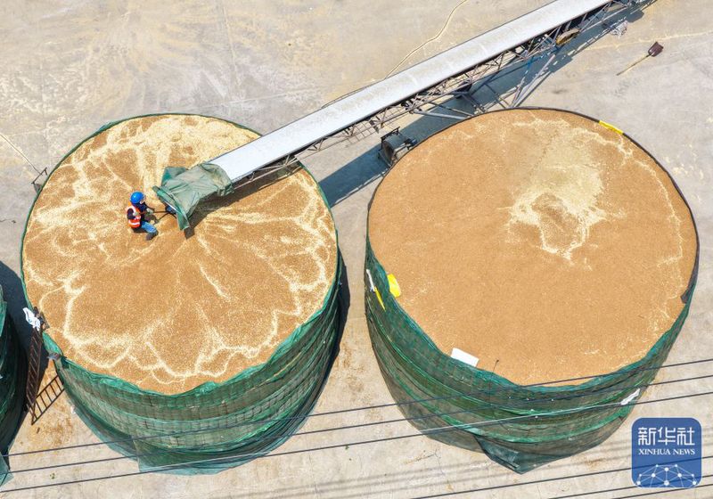 三河農(nóng)場收獲的小麥進(jìn)入大華種業(yè)三河分公司存儲(chǔ)(5月28日攝,無人機(jī)照片)。新華社發(fā)(許昌銀攝)