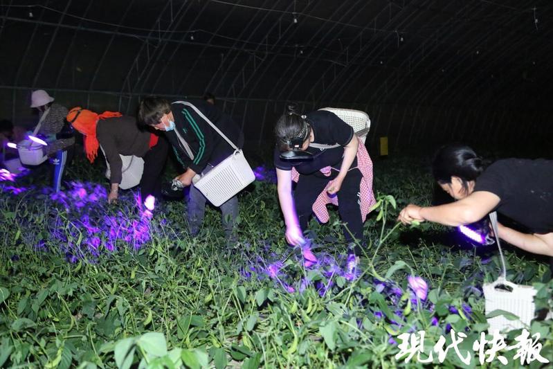 “搜尋時一定要仔細,左右兩邊都得留意,才能把豆丹抓全?!眴误w2號大棚的豆丹養(yǎng)殖負責(zé)人李加祥一邊熟練地捕捉豆丹,一邊向工作人員傳授經(jīng)驗,“豆丹和豆葉顏色相近,白天捕捉極易遺漏。但到了夜間,紫光燈一照,豆丹就像會發(fā)光的螢火蟲,清晰可見,不僅抓捕效率高,還能做到顆粒歸倉?!睘榇_保此次捕捉行動順利開展,園區(qū)提前規(guī)劃,從人員調(diào)配到工具準備,每一個環(huán)節(jié)都精心部署,為高效捕捉打下堅實基礎(chǔ)。