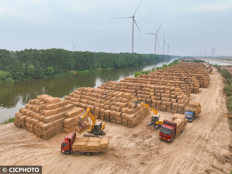 ↑2025年6月7日,在位于江蘇省鹽城市射陽(yáng)縣的江蘇農(nóng)墾新洋農(nóng)場(chǎng)秸稈回收中心,農(nóng)民駕駛機(jī)械整理回收的小麥秸稈。(無(wú)人機(jī)照片)CICPHOTO/張偉生 攝