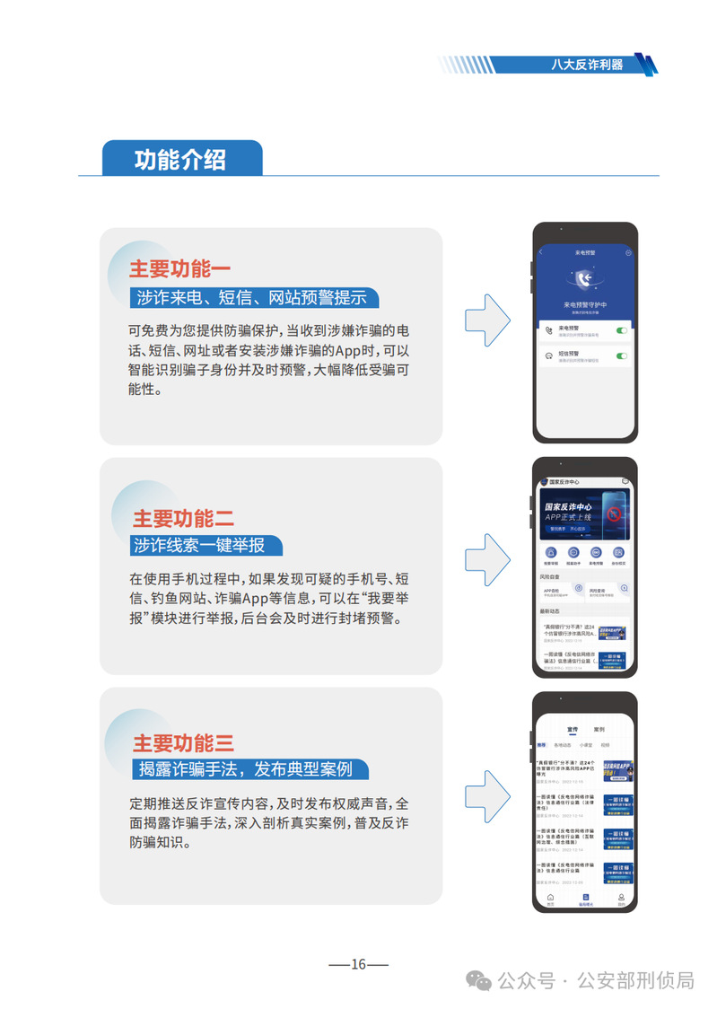 《手冊》詳細梳理了刷單返利、虛假網(wǎng)絡(luò)投資理財、虛假購物服務(wù)、冒充電商物流客服、貸款征信、冒充領(lǐng)導熟人、冒充公檢法、婚戀交友、網(wǎng)絡(luò)游戲產(chǎn)品虛假交易、機票退改簽等10類高發(fā)的電信網(wǎng)絡(luò)詐騙類型,通過典型案例剖析,逐個解析詐騙套路,揭批作案手法,為易受騙群體“量身定制”反詐防騙提示。同時,《手冊》詳細介紹了前期公安部會同工信部、中國人民銀行推出的七大反詐利器——國家反詐中心APP、96110預警勸阻專線、12381涉詐預警勸阻短信系統(tǒng)、全國移動電話卡“一證通查”、全國互聯(lián)網(wǎng)賬號“一證通查”、反詐名片、云閃付APP“一鍵查卡”,以及今年工信部推出的第八個反詐利器——跨境提醒服務(wù),幫助群眾有效甄別境外來電。此外,《手冊》首次總結(jié)提煉了幫助群眾快速破譯騙局的20個防詐關(guān)鍵詞,切實構(gòu)筑攔截電信網(wǎng)絡(luò)詐騙的“防火墻”。