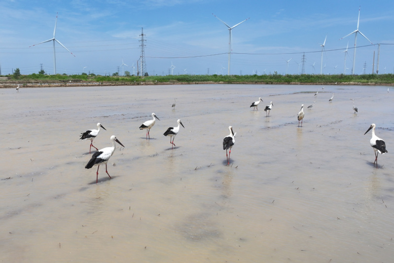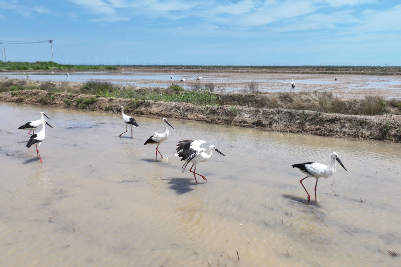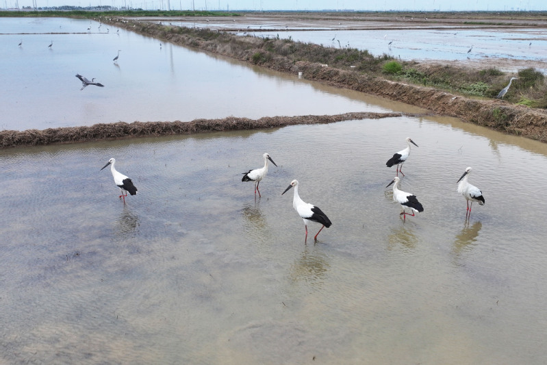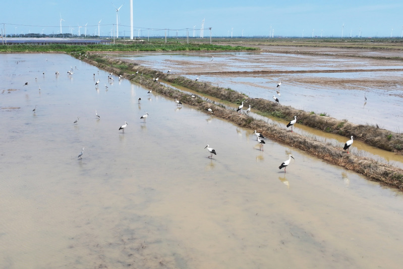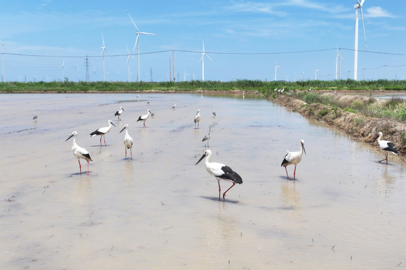 6月23日,江蘇省鹽城市射陽縣臨海農(nóng)場順泰生產(chǎn)區(qū)的水田里,50余只國家一級保護(hù)動物東方白鸛姿態(tài)優(yōu)雅,正悠然漫步、覓食,與水田的碧波相互映襯,構(gòu)成一幅靈動的生態(tài)畫卷。