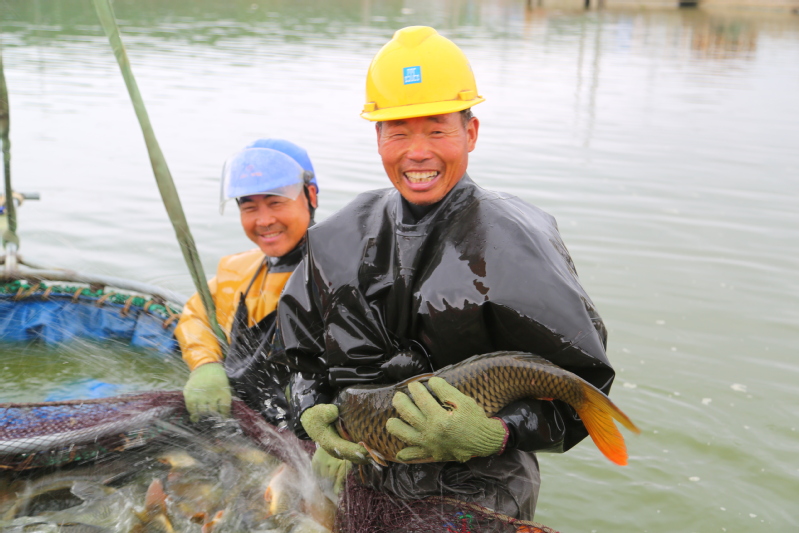 正值淡水魚(yú)出塘上市季節(jié),江蘇省連云港市海州區(qū)江蘇農(nóng)墾崗埠農(nóng)場(chǎng)南漁場(chǎng),大型吊車(chē)正在起網(wǎng)捕撈鯉魚(yú),一幅人歡魚(yú)躍的水上夏收景象。圖為漁民在展示捕撈的大鯉魚(yú)?! ⌒煨l(wèi) 攝(來(lái)源:大國(guó)三農(nóng))