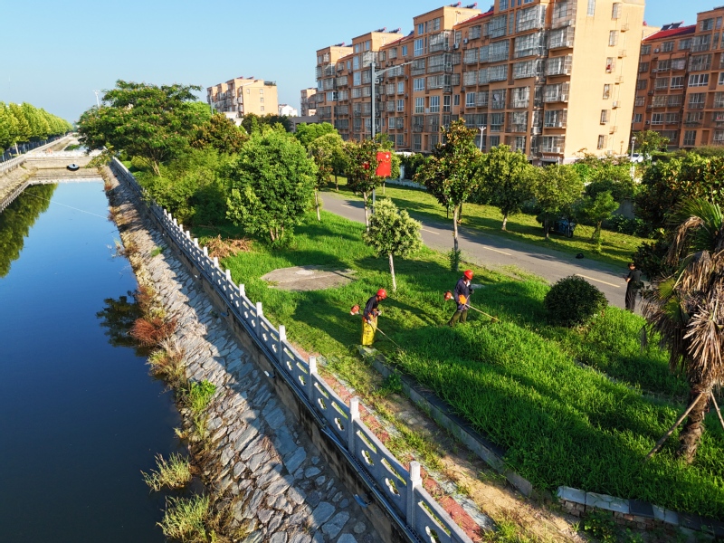 連日來(lái),連云港市海州區(qū)加緊推進(jìn)環(huán)境綜合整治工作,著力打造“河暢、水清、岸綠、景美”的優(yōu)美環(huán)境。圖為8月21日,位于該區(qū)的江蘇農(nóng)墾崗埠農(nóng)場(chǎng)綠化工人在振興河畔修剪管護(hù)草坪。