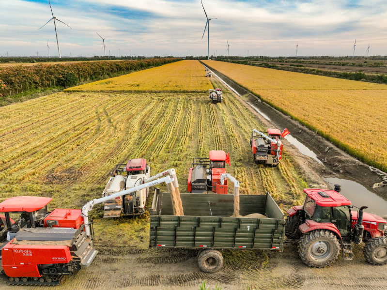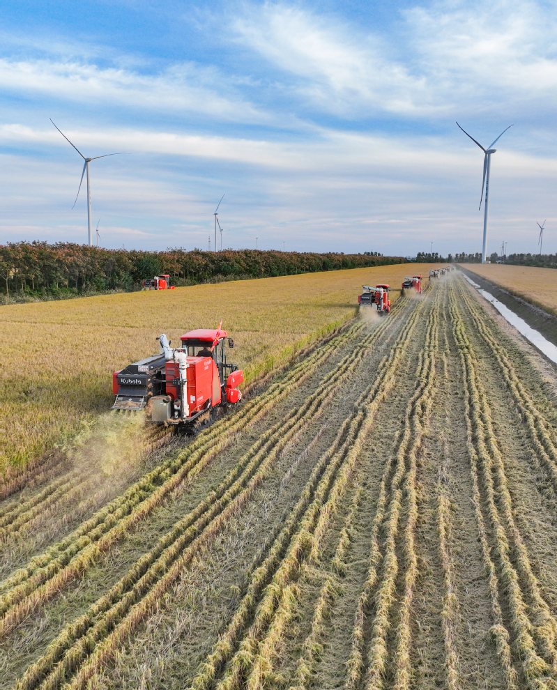 11月3日,江蘇省鹽城市射陽(yáng)縣新洋農(nóng)場(chǎng)組織收割機(jī)械,對(duì)高標(biāo)準(zhǔn)農(nóng)田中的優(yōu)質(zhì)水稻進(jìn)行搶收作業(yè),確保秋糧顆粒歸倉(cāng),不誤農(nóng)時(shí)。 作者:張偉生