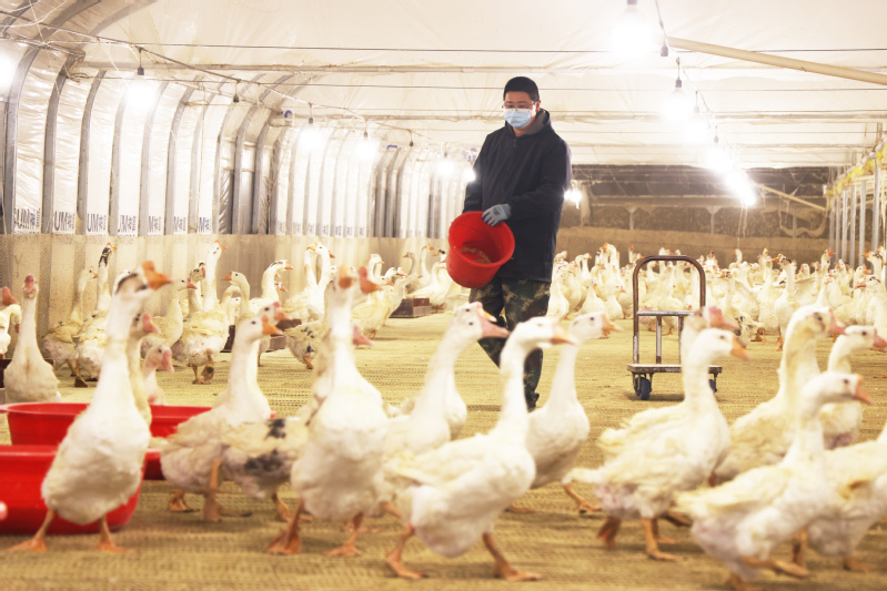 在臨海農(nóng)場種鵝養(yǎng)殖基地的鵝棚內(nèi),青年養(yǎng)殖人員正專心進行喂食、撿蛋工作。