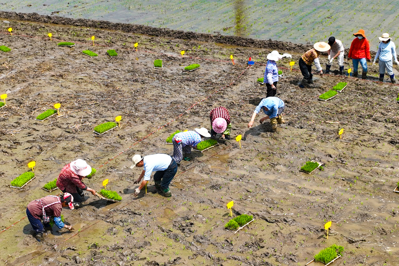 端午假期第一天,蘇墾農(nóng)發(fā)南通分公司3大隊田頭一片忙碌景象。烈日下,7位農(nóng)技人員彎著腰在水稻田一字排開移栽秧苗,腳下步履維艱、鼻頭汗珠滴落。按照隊伍兩頭農(nóng)技人員手拉的直線,他們小心翼翼地從秧盤上取下秧苗,左手握苗,右手插秧,確保行距25厘米,株距20厘米,每穴2株,橫豎成線、深度適中。每隔一段距離,田間都會插上一塊寫明實驗數(shù)據(jù)的標(biāo)簽?!安煌臉?biāo)簽對應(yīng)了不同的試驗稻種。人工插秧可以確保水稻增產(chǎn)試驗的科學(xué)性、嚴(yán)謹(jǐn)性、準(zhǔn)確性?!碧K墾農(nóng)發(fā)南通分公司農(nóng)業(yè)中心主任趙中華表示。今年,蘇墾農(nóng)發(fā)南通分公司大力推進(jìn)農(nóng)業(yè)科技創(chuàng)新,與南通大學(xué)生命科學(xué)學(xué)院合作開展水稻高產(chǎn)技術(shù)研發(fā),為南通稻米產(chǎn)業(yè)供給性結(jié)構(gòu)優(yōu)化、品質(zhì)提升、節(jié)本增效和綠色高產(chǎn)提供技術(shù)支撐。前期,校企雙方分別對南粳46、南粳5055稻種以微波、離心、超聲波等3種方式,按時間長度各進(jìn)行32種處理。落谷前,蘇墾農(nóng)發(fā)南通分公司對不同品種、不同處理的水稻種子提前進(jìn)行了篩選、收集、稱重、貼標(biāo)、裝袋等準(zhǔn)備工作,同時與相關(guān)農(nóng)業(yè)大隊溝通協(xié)調(diào)好浸種催芽時間,在種子露白后及時安排工人與農(nóng)機(jī),掌握好落谷的最佳時機(jī)與最優(yōu)質(zhì)量,控制種子秧盤播撒的均勻度,精準(zhǔn)把控好土壤濕度與精細(xì)