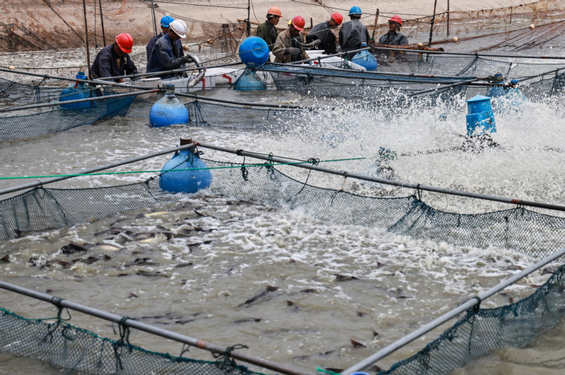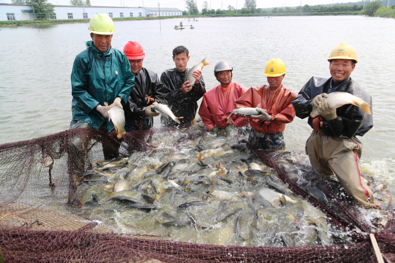 春放秋捕,共話豐收。走進(jìn)崗埠農(nóng)場公司南漁場的鯉魚養(yǎng)殖基地,一條條肥美的鯉魚不斷躍出水面,引起水花四濺。8月29日,崗埠農(nóng)場公司水產(chǎn)養(yǎng)殖中心迎來鯉魚“大豐收”,養(yǎng)殖基地內(nèi)熱鬧開捕秋天第一網(wǎng)鯉魚。初秋的早晨已然涼意十足,早上不到6點(diǎn),天剛蒙蒙亮,捕撈人員就來到魚塘開網(wǎng)起魚。在水產(chǎn)公司工作人員的指揮下,一張巨大的漁網(wǎng)隨著捕魚工人的移動緩緩張開,大家不顧冰冷的水下溫度,緊張忙碌了起來。經(jīng)過鋪底、收網(wǎng)、聚攏等環(huán)節(jié)的共同協(xié)作,漁網(wǎng)被慢慢升起……整個現(xiàn)場一片繁忙熱鬧景象。經(jīng)過近三個小時的忙碌,在大家的精心分揀下,裝滿魚的筐子被吊車有序吊起,稱重、記錄、放魚一氣呵成?!斑@個吊車頂部的黃色圓塊就是電子秤,吊起魚的同時,秤上的信號就發(fā)到這個無線接收裝置上來,秤重既方便又精準(zhǔn)?!爆F(xiàn)場記賬的方正解釋說?!翱催@些魚,品相好、質(zhì)量高,抓都抓不住,活蹦亂跳的,真是大豐收啊!”起魚的工人們雖然全身都已濕透,但是看著手里的大魚,臉上洋溢著收獲的笑容。據(jù)悉,本次捕撈的鯉魚名叫“福安鯉”,在春季投放,采取訂單式捕撈銷售。當(dāng)天,2.2萬斤“淮河牌”福安鯉被送上等候已久的運(yùn)輸車,銷往本省徐州市及河南省等地?!梆B(yǎng)殖中心依托豐富水